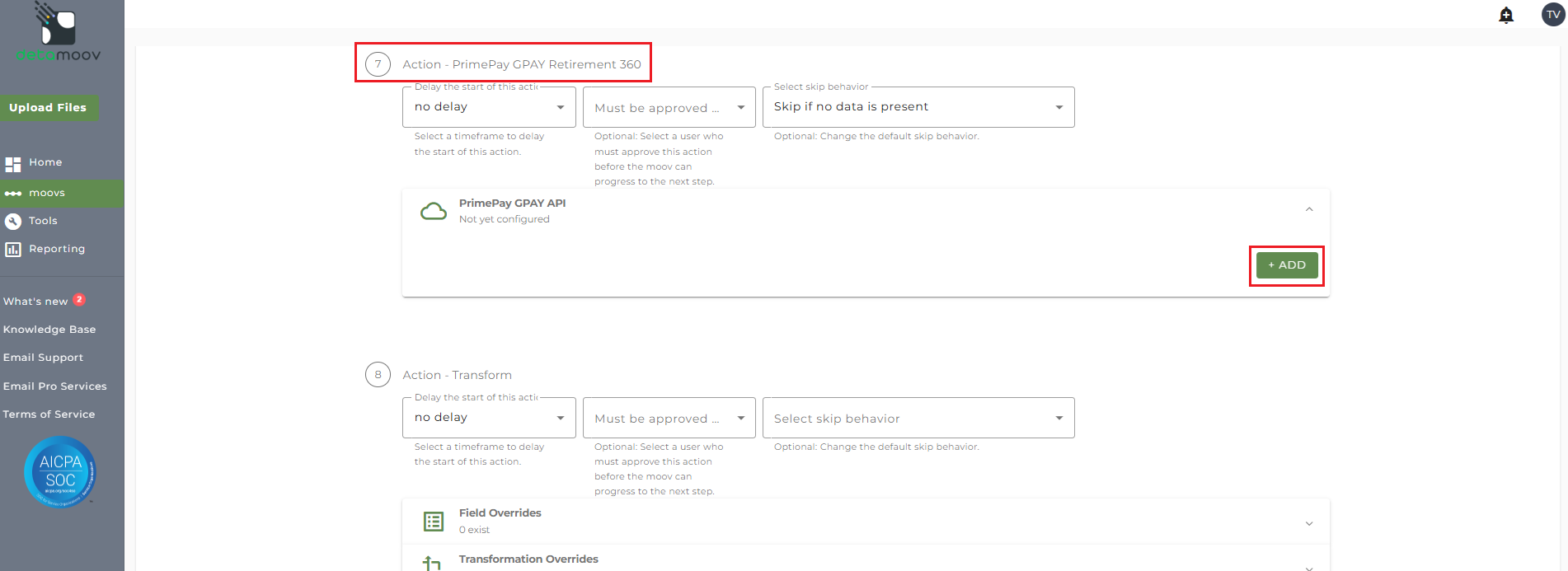 To configure the PrimePay GPAY Retirement 360 step for you client, locate the Action - PrimePay GPAY Retirement 360 step, expand the PrimePay GPAY API panel and click ADD.