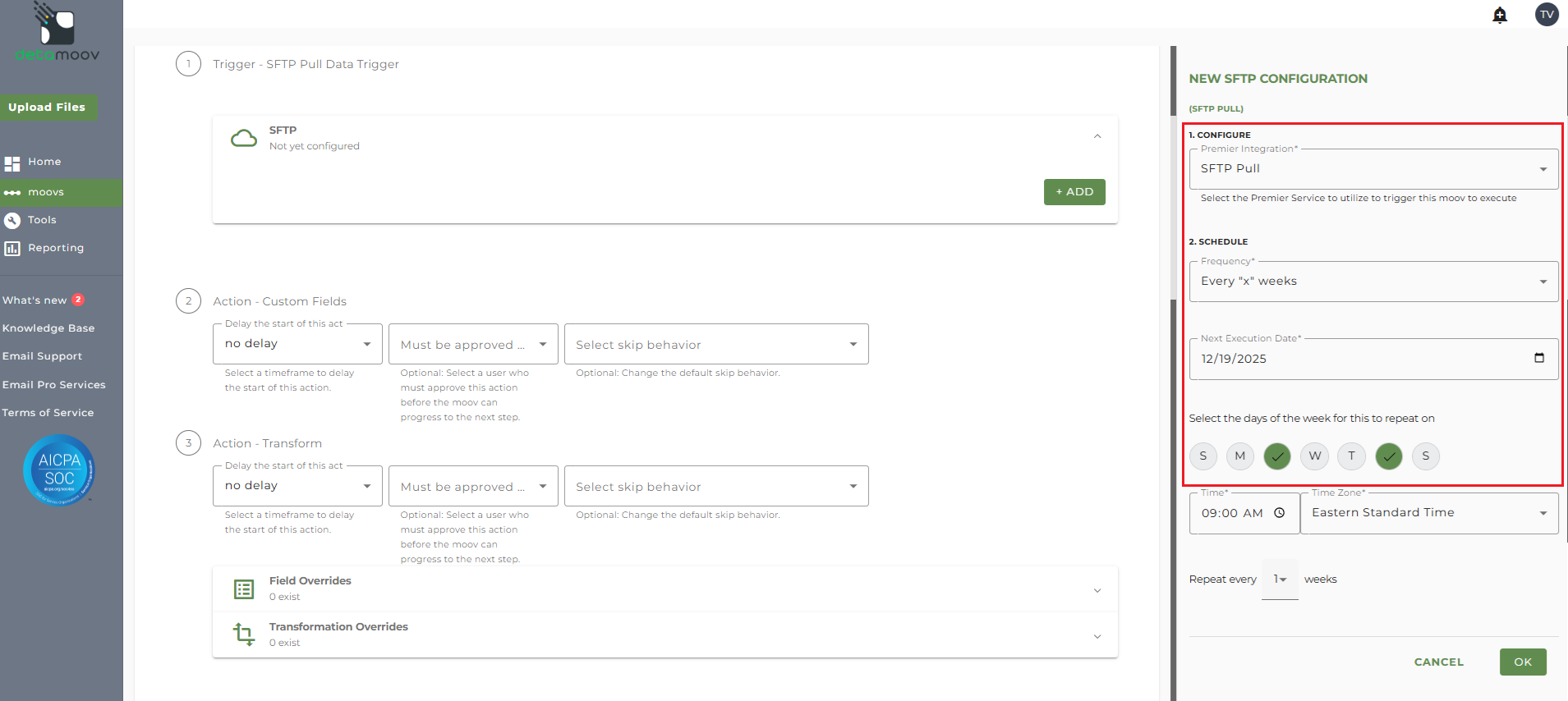 On the New SFTP Configuration section on the right, select the SFTP Pull option from the Premier Integration menu. Then select either "Every X weeks" or "On certain days of the month", depending on how often you would like detamoov to check for new feedback files. We recommend that you check for feedback files at least twice a week. In the example below, we have set up a schedule to check for files twice a week on Tuesdays and Fridays.