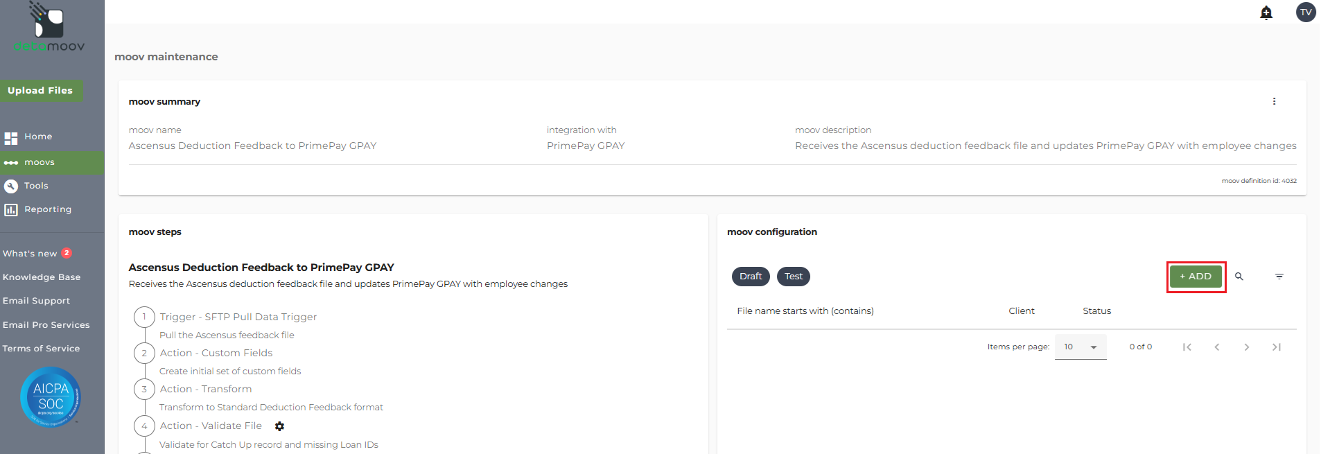 To add a moov to your account, click on moovs on the left hand menu and click the ADD button in the upper right.