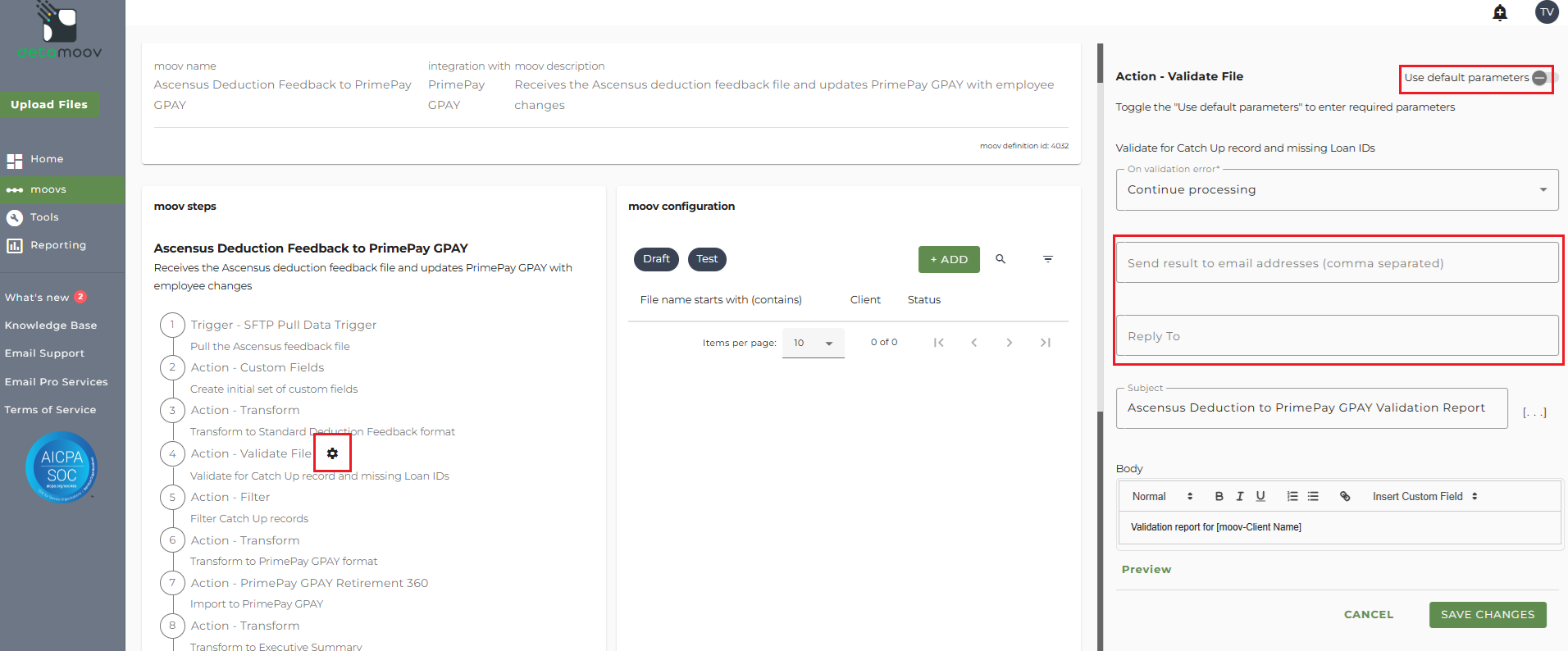 To edit the validate file step, click on the cog icon under the Action - Validate Files step on the left. Then toggle the "Use default parameters" off and enter in the email addresses you would like to receive the notification. If you would like to enter multiple email addresses, separate them with a comma. A Reply to email is also required in the event that a recipient of the notification replies to the email.