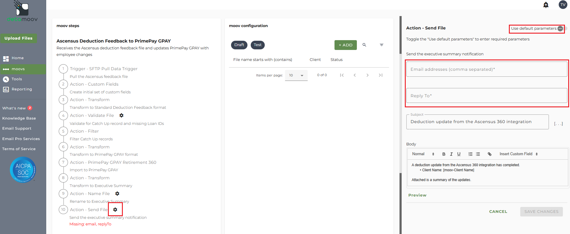 Note: these settings apply to any client configuration you set up for this specific moov. You also have the ability to configure the send file step for each client configuration if you wish to add or remove email addresses per client.