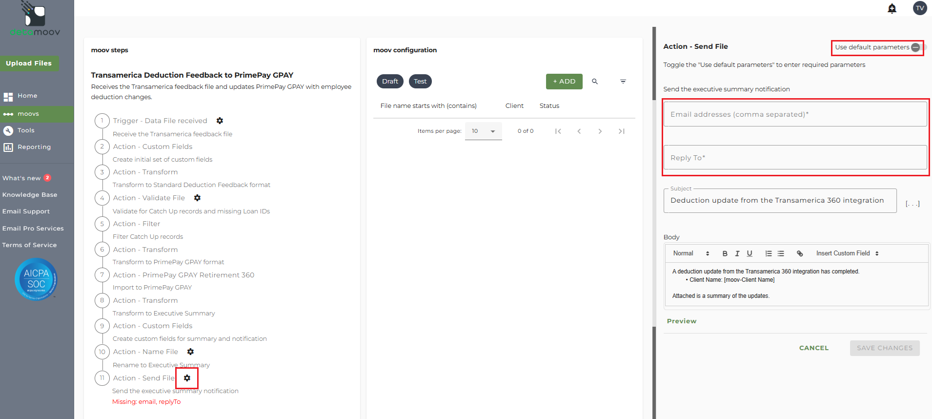 Note: these settings apply to any client configuration you set up for this specific moov. You also have the ability to configure the send file step for each client configuration if you wish to add or remove email addresses per client.