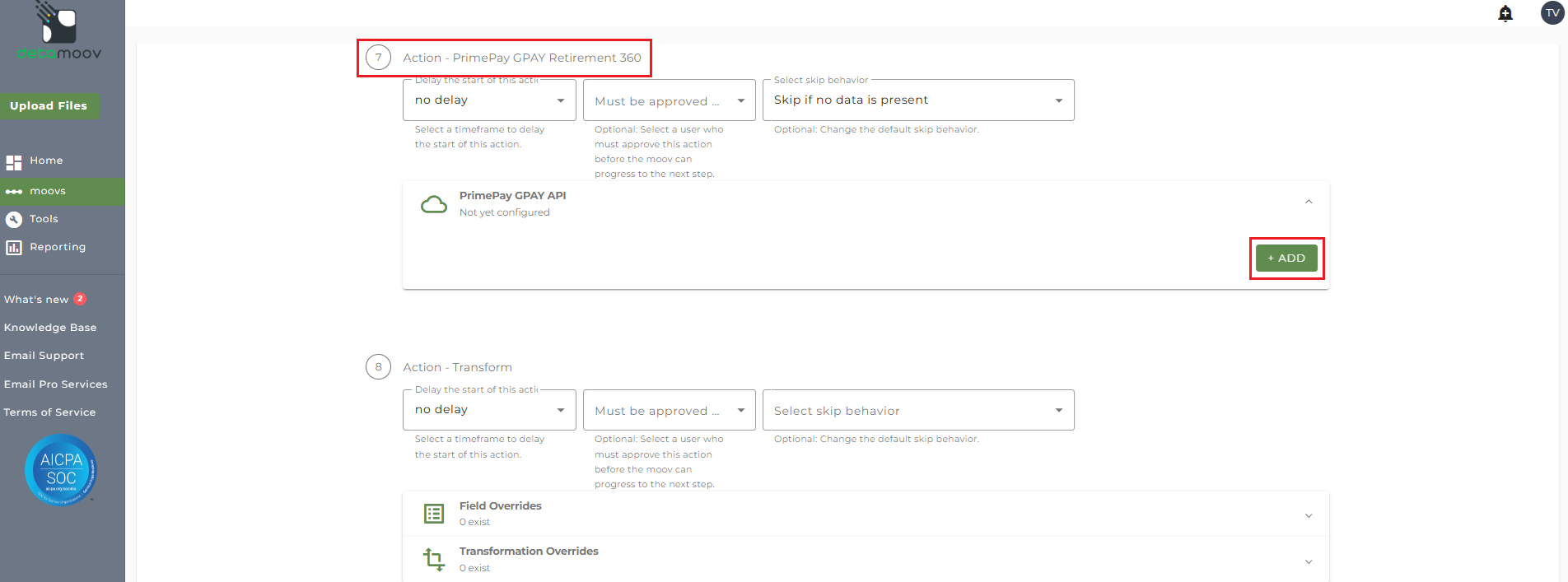 To configure the PrimePay GPAY Retirement 360 step for you client, locate the Action - PrimePay GPAY Retirement 360 step, expand the PrimePay GPAY API panel and click ADD.