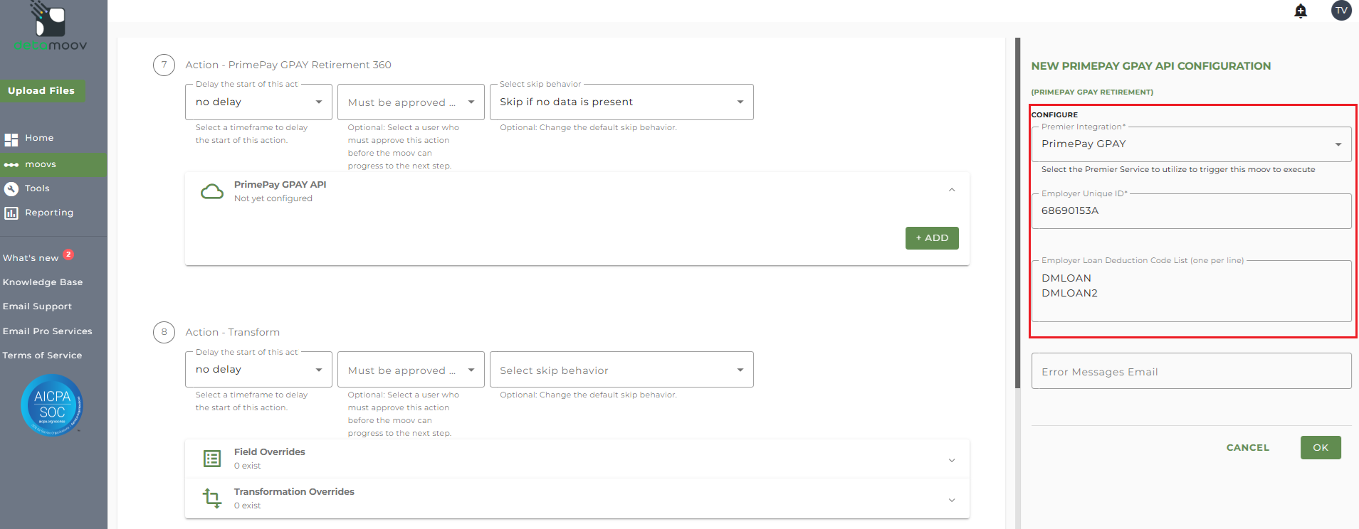 The Transamerica Deduction Feedback to PrimePay GPAY moov provides a notification once the moov is complete with a summary of the retirement plan changes that were made in PrimePay GPAY. The notification can be sent to any email address you wish and can also be configured to send to multiple email addresses.