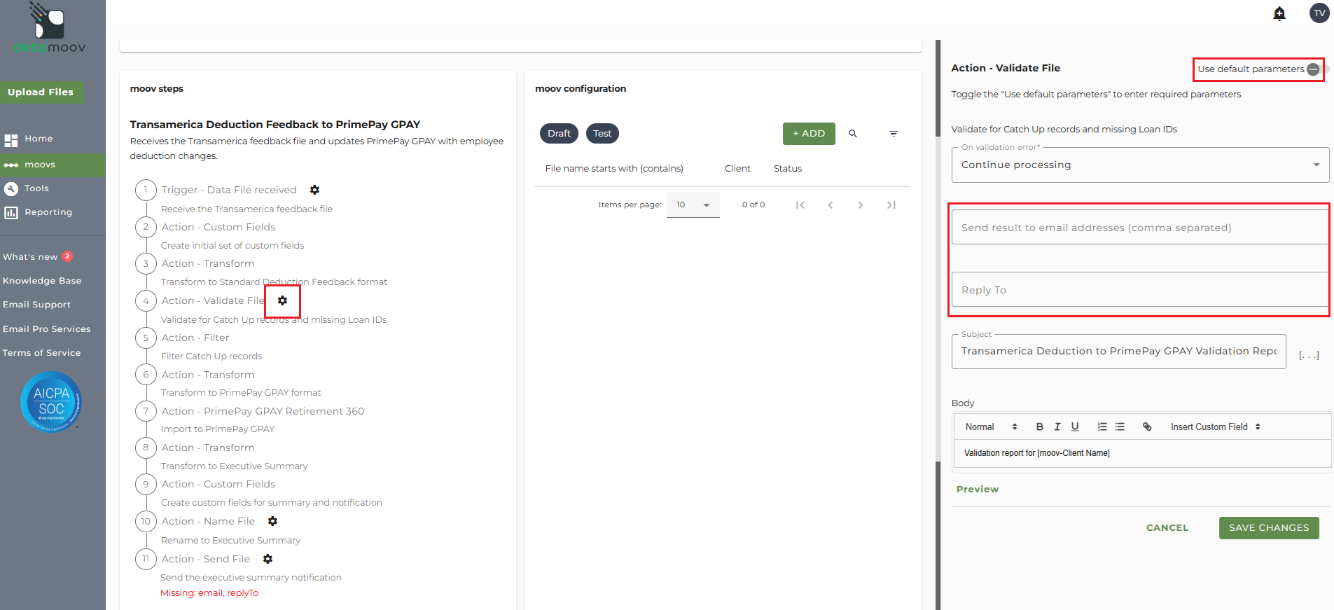 To edit the validate file step, click on the cog icon under the Action - Validate Files step on the left. Then toggle the "Use default parameters" off and enter in the email addresses you would like to receive the notification. If you would like to enter multiple email addresses, separate them with a comma. A Reply to email is also required in the event that a recipient of the notification replies to the email.