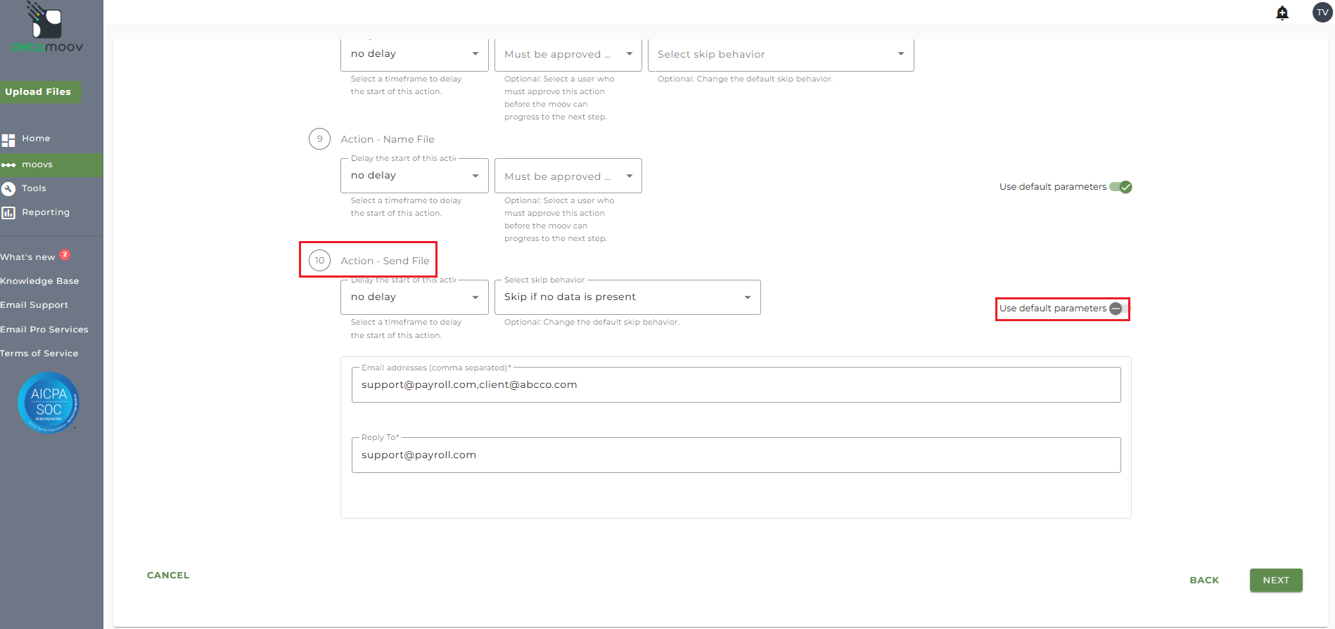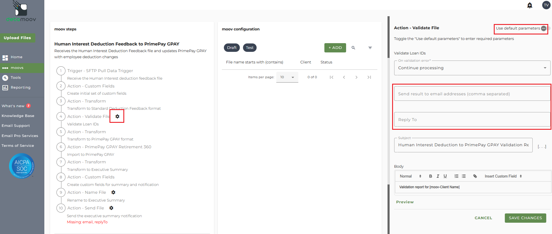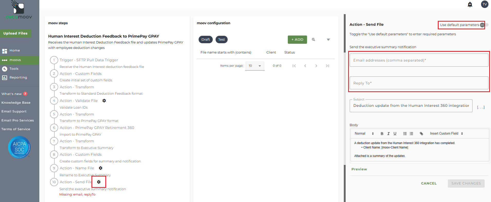 Note: these settings apply to any client configuration you set up for this specific moov. You also have the ability to configure the send file step for each client configuration if you wish to add or remove email addresses per client.