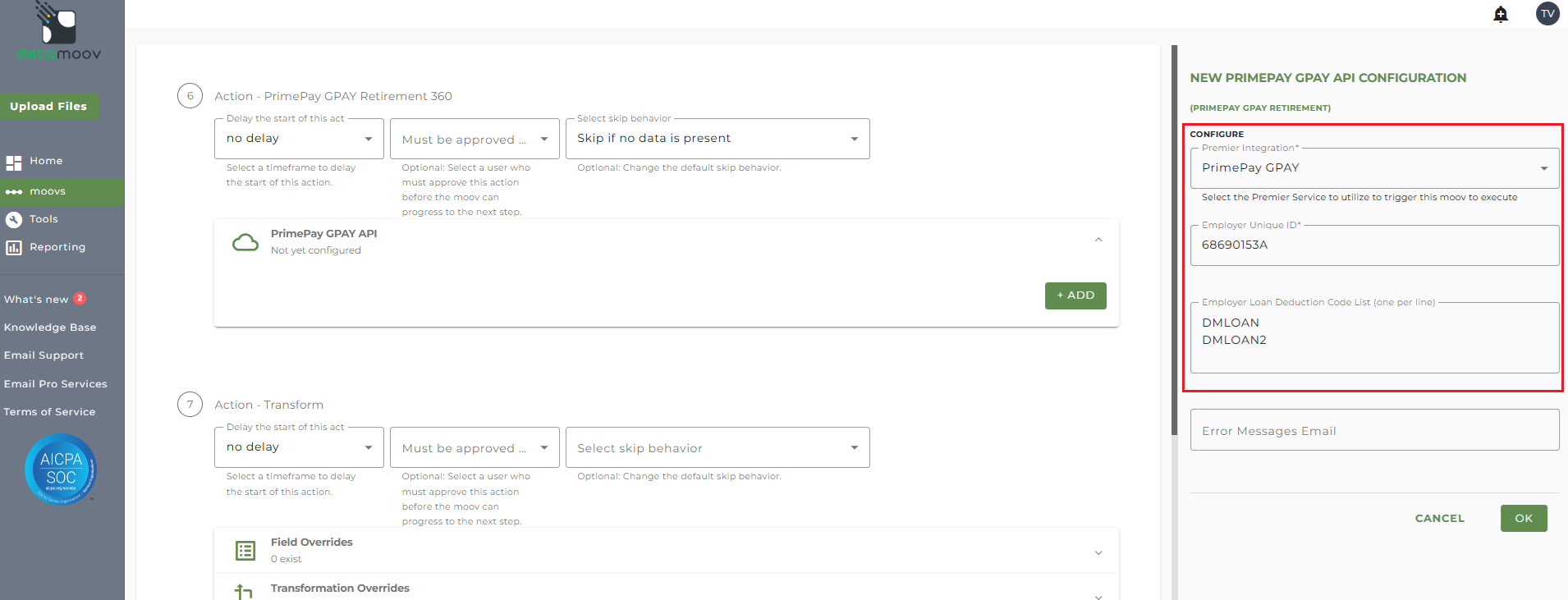 You can also enter in one or more email addresses in the Error Messages Email. If left blank, all detamoov users on your account will receive emails if the PrimePay GPAY API import fails.