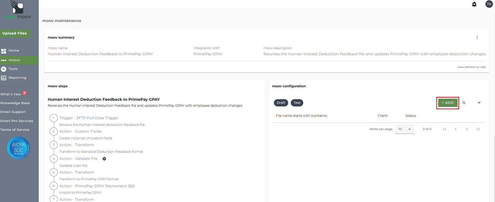 To add a moov to your account, click on moovs on the left hand menu and click the ADD button in the upper right.