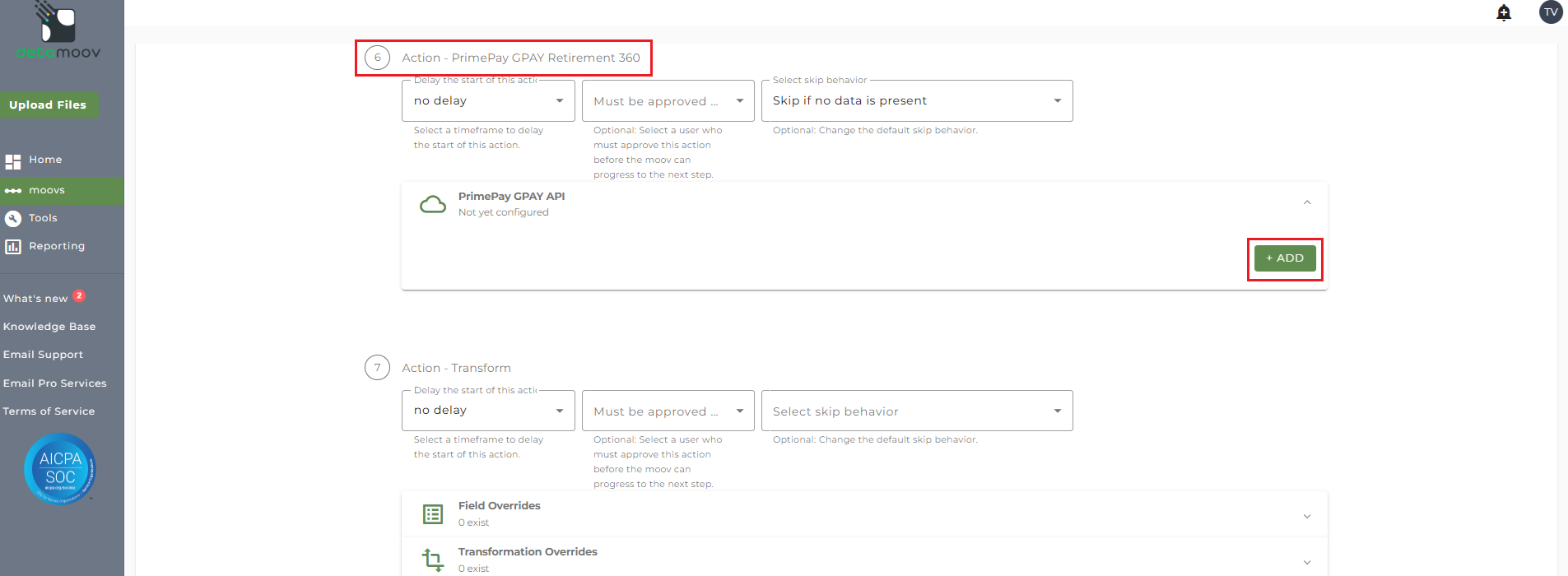To configure the PrimePay GPAY Retirement 360 step for you client, locate the Action - PrimePay GPAY Retirement 360 step, expand the PrimePay GPAY API panel and click ADD.