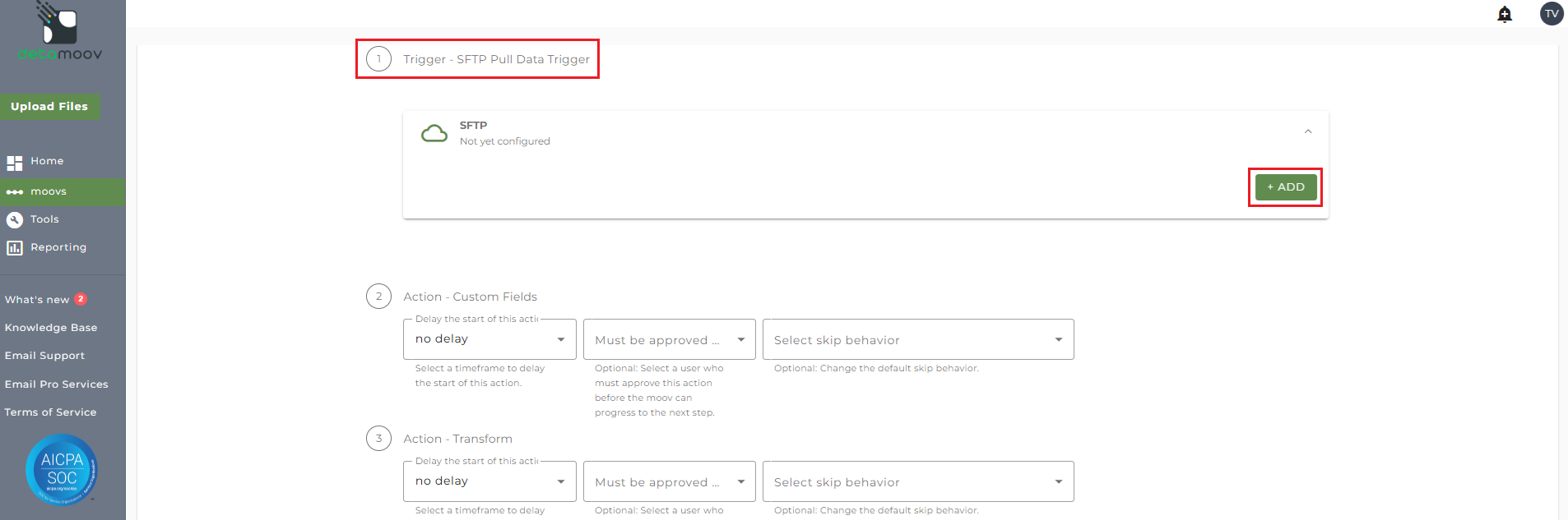 To automate the 360 integration, configure the SFTP schedule. Click the SFTP banner under the Trigger - SFTP Pull Data Trigger step and click Add.
