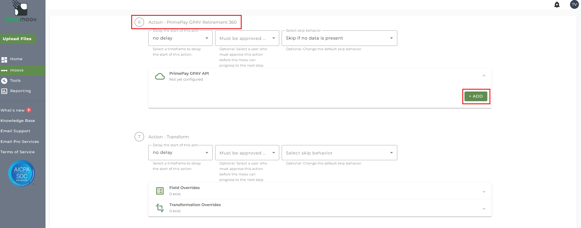 To configure the PrimePay GPAY Retirement 360 step for you client, locate the Action - PrimePay GPAY Retirement 360 step, expand the PrimePay GPAY API panel and click ADD.