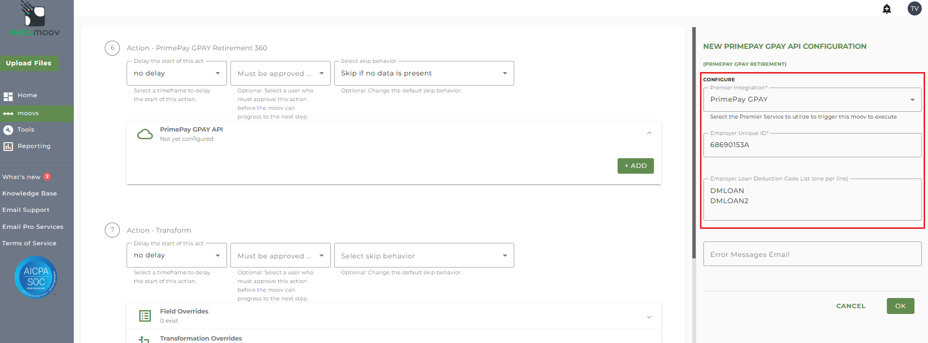 You can also enter in one or more email addresses in the Error Messages Email. If left blank, all detamoov users on your account will receive emails if the PrimePay GPAY API import fails.