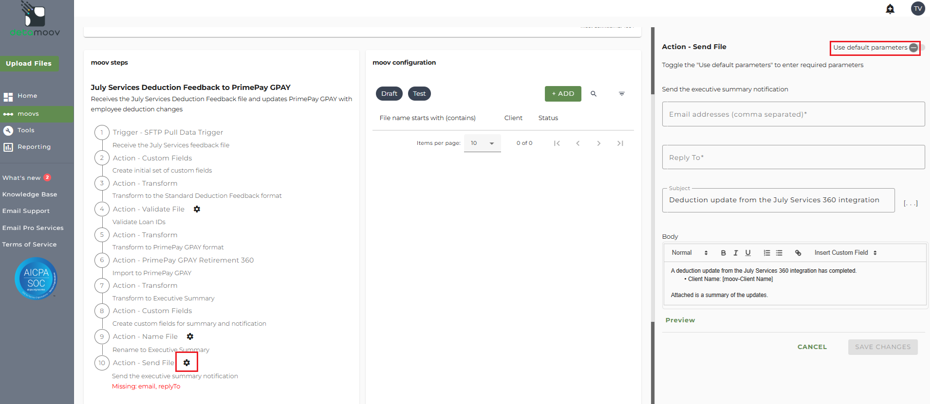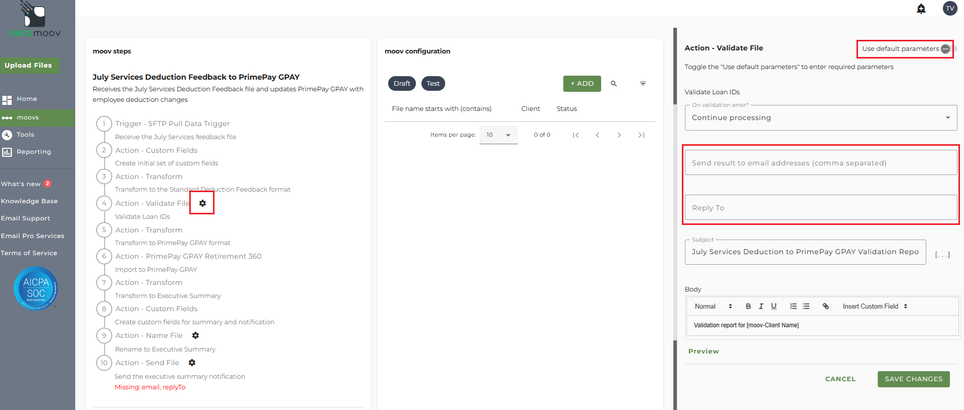 Note: these settings apply to any client configuration you set up for this specific moov. You also have the ability to configure the send file step for each client configuration if you wish to add or remove email addresses per client.