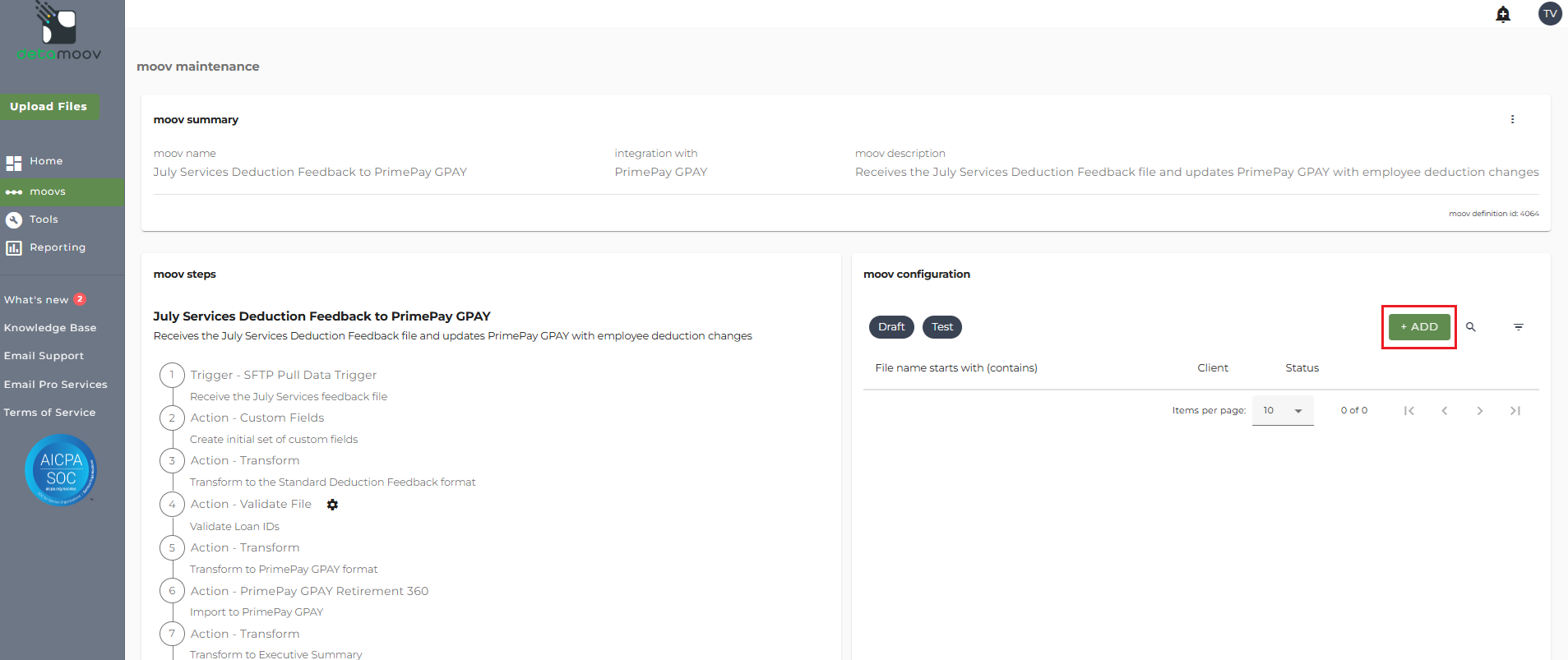 To add a moov to your account, click on moovs on the left hand menu and click the ADD button in the upper right.