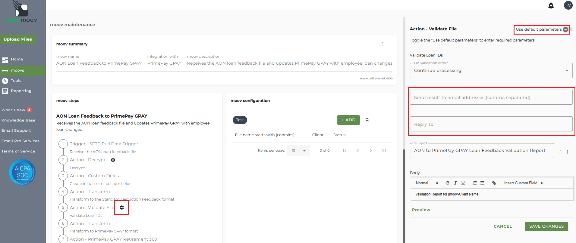 At the beginning of this article you configured the send file step for the moov to send a notification once the moov had completed. You also have the ability to configure the send file step for each client configuration if you wish to add or remove email addresses per client.