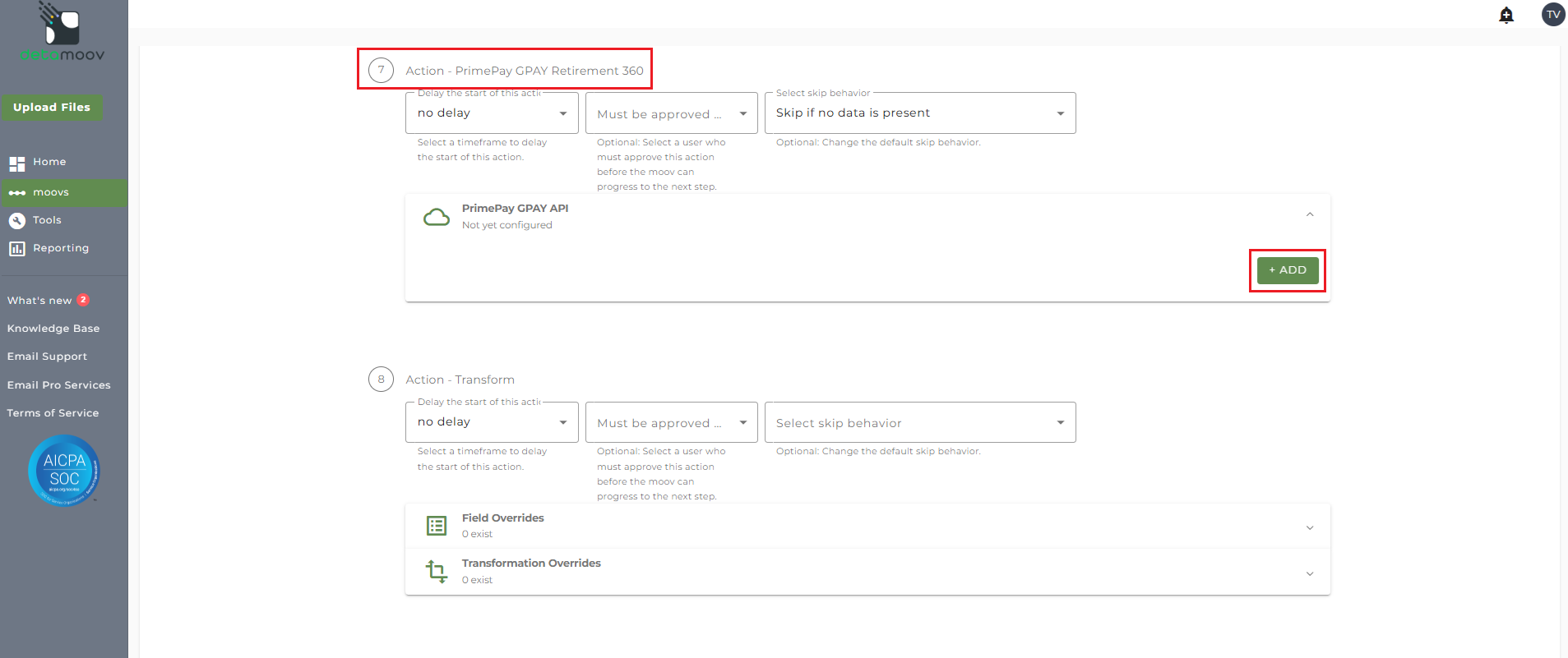 To configure the PrimePay GPAY Retirement 360 step for you client, locate the Action - PrimePay GPAY Retirement 360 step, expand the PrimePay GPAY API panel and click ADD.