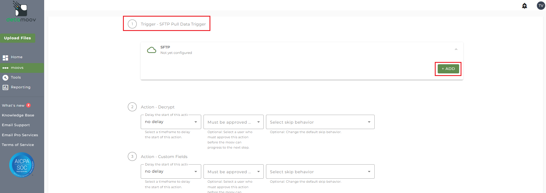 To automate the 360 integration, configure the SFTP schedule. Click the SFTP banner under the Trigger - SFTP Pull Data Trigger step and click Add.