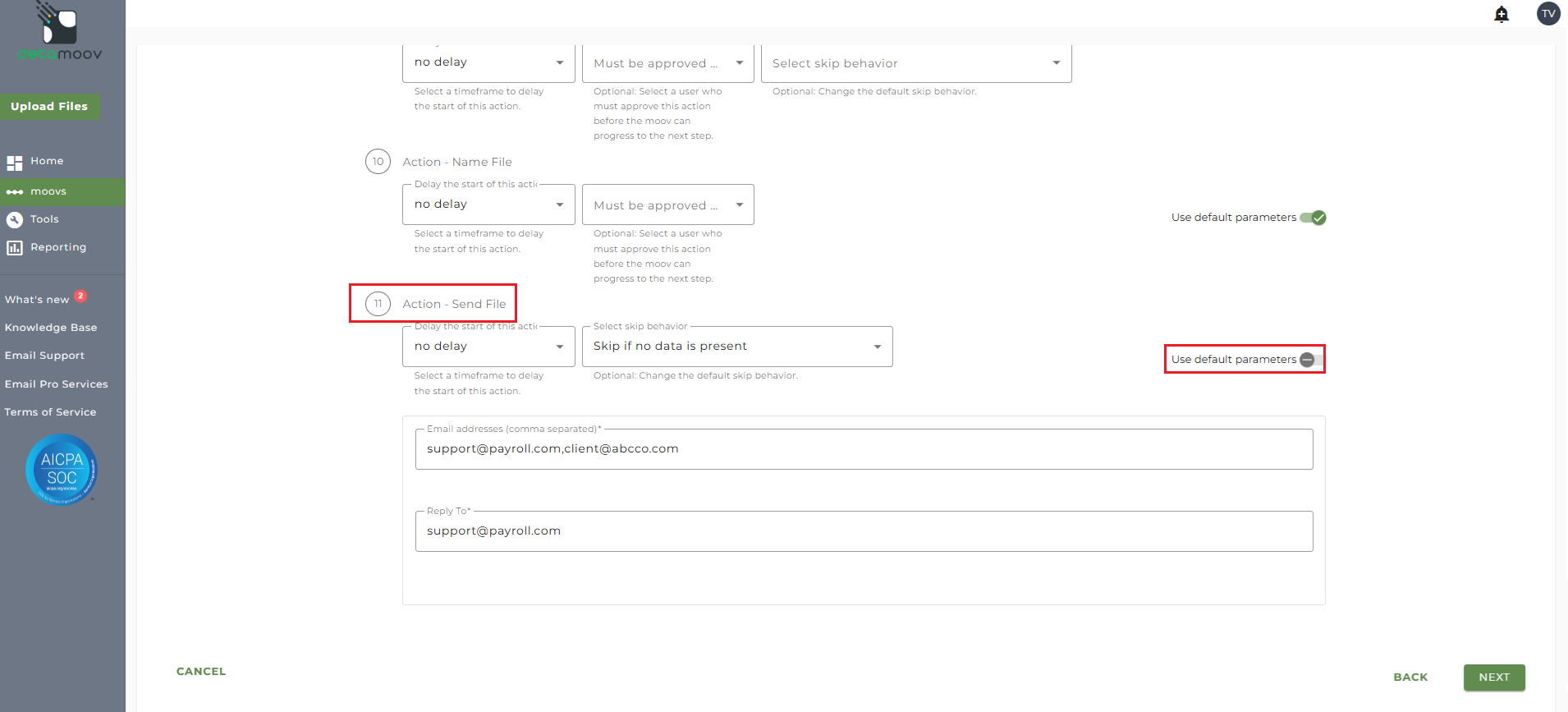 Note: these settings apply to any client configuration you set up for this specific moov. You also have the ability to configure the send file step for each client configuration if you wish to add or remove email addresses per client.
