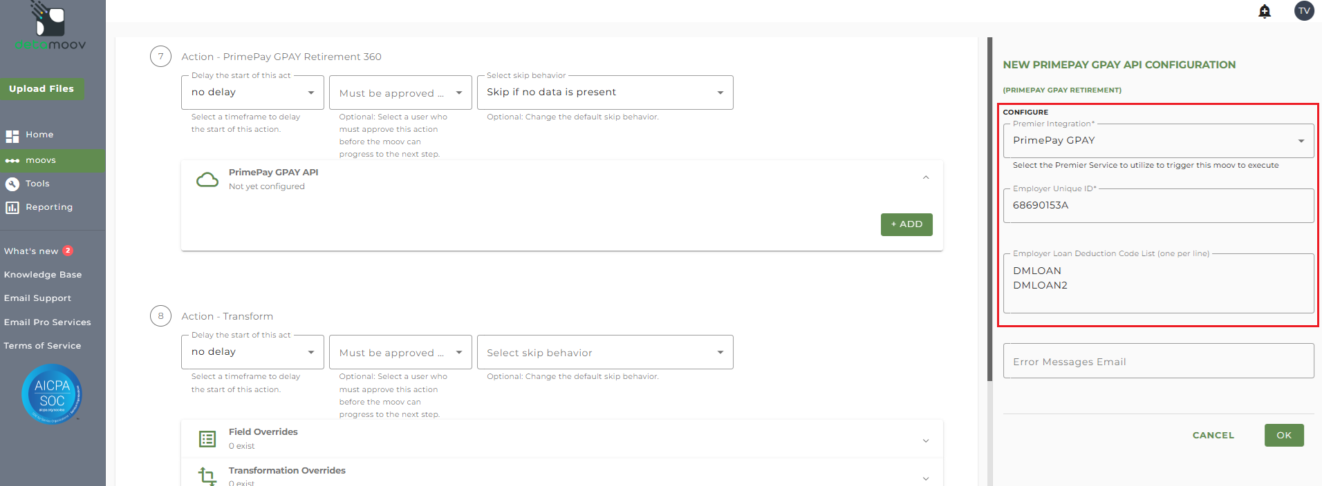 The AON Loan Feedback to PrimePay GPAY moov provides a notification once the moov is complete with a summary of the retirement plan changes that were made in PrimePay GPAY. The notification can be sent to any email address you wish and can also be configured to send to multiple email addresses.