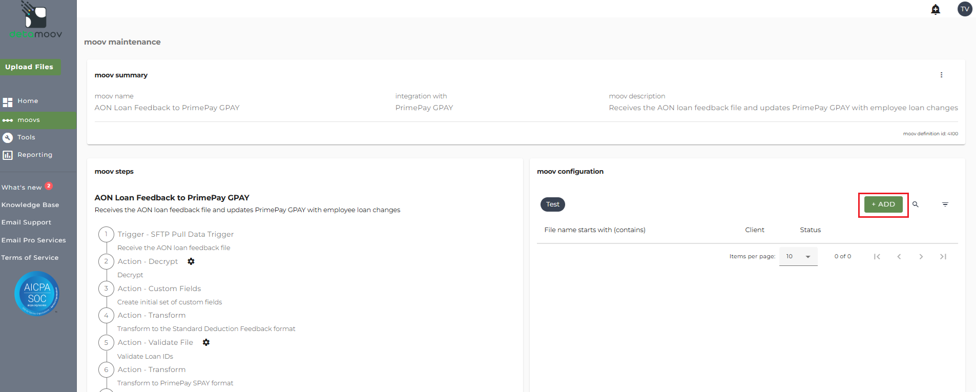 To add a moov to your account, click on moovs on the left hand menu and click the ADD button in the upper right.