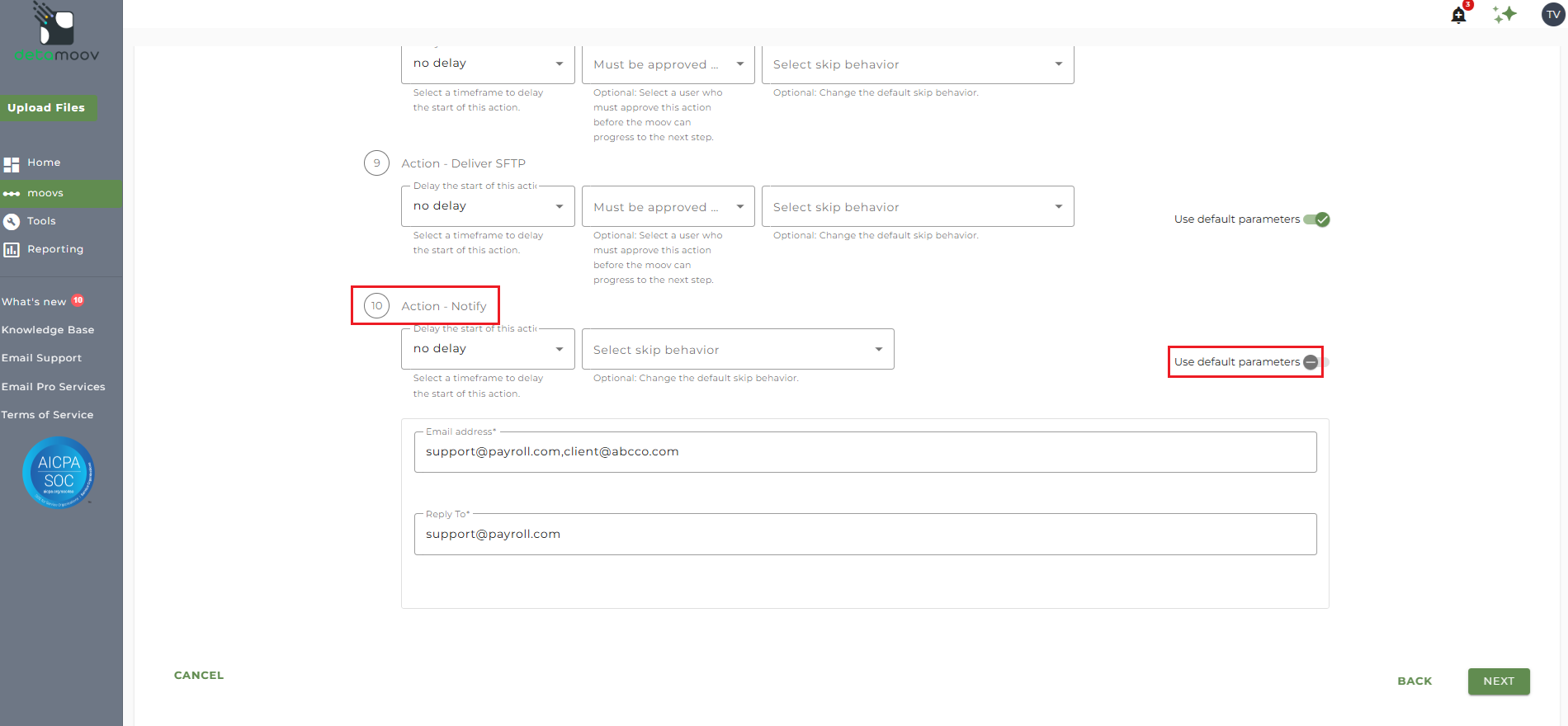 Note: these settings apply to any client configuration you set up for this specific moov. You also have the ability to configure the notification step for each client configuration if you wish to add or remove email addresses per client.