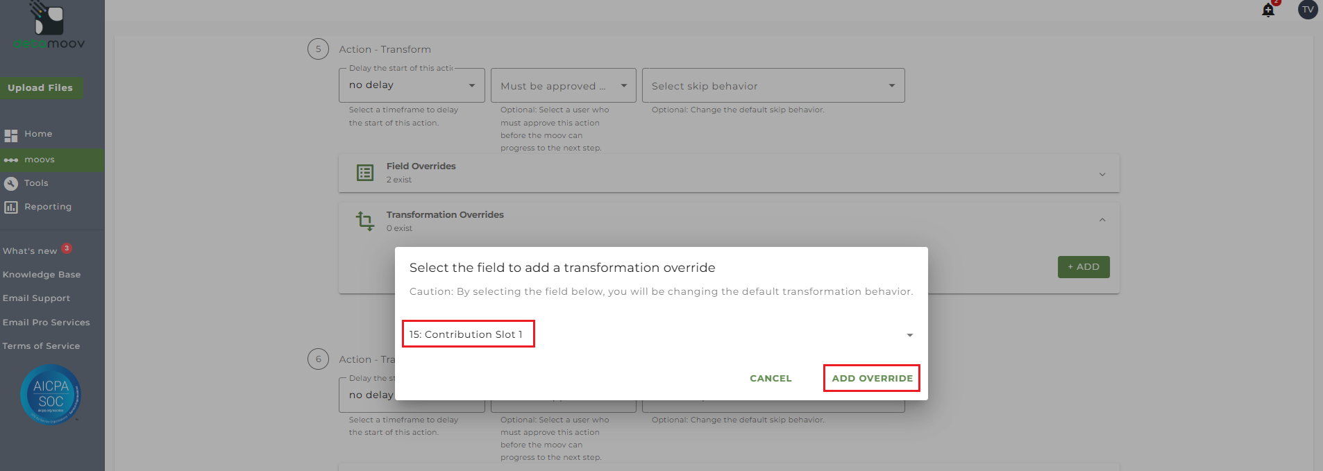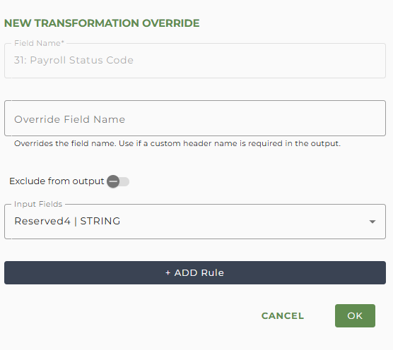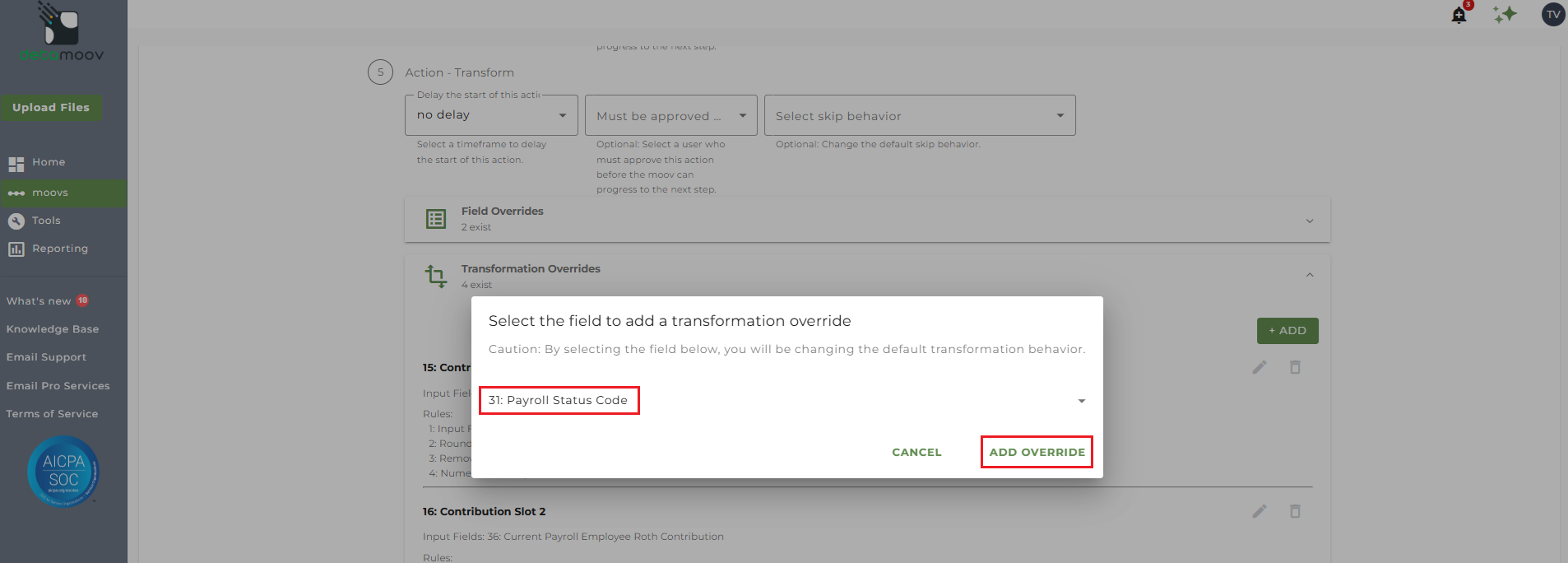 To create an override for the Payroll Status Code, locate step 5: Action - Transform, expand the Transformation Overrides panel, click the Add button, select field 31: Payroll Status Code and click ADD OVERRIDE.