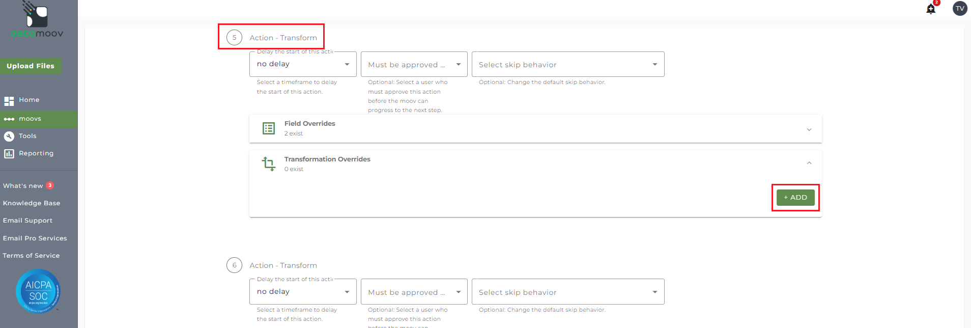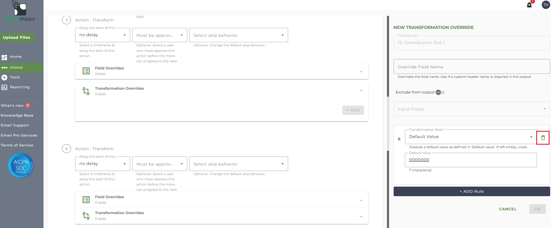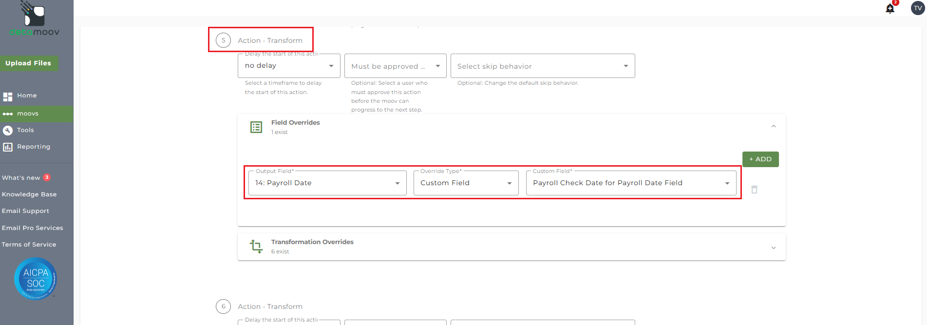 To create an override for the Payroll Status Code, locate step 5: Action - Transform, expand the Transformation Overrides panel, click the Add button, select field 31: Payroll Status Code and click ADD OVERRIDE.