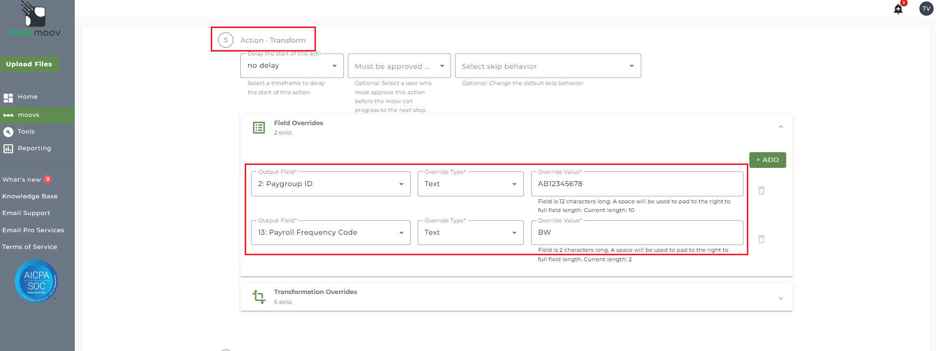 Corebridge Financial requires that the Paygroup ID and Payroll Frequency Code be included for each employee. To include this information a Field Override is required. To add a Field Override locate step 5: Action - Transform, expand the Field Overrides panel and click the Add button. Then select the appropriate Output field, set the Override Type to Text and enter the Override Value.