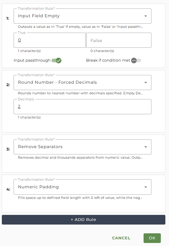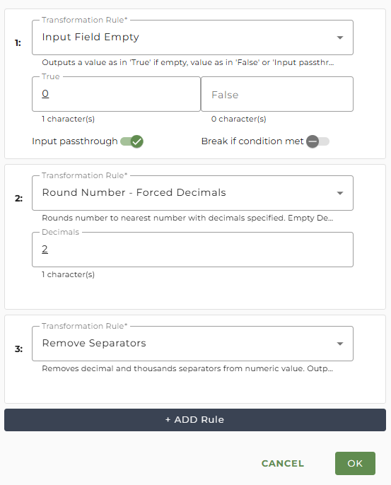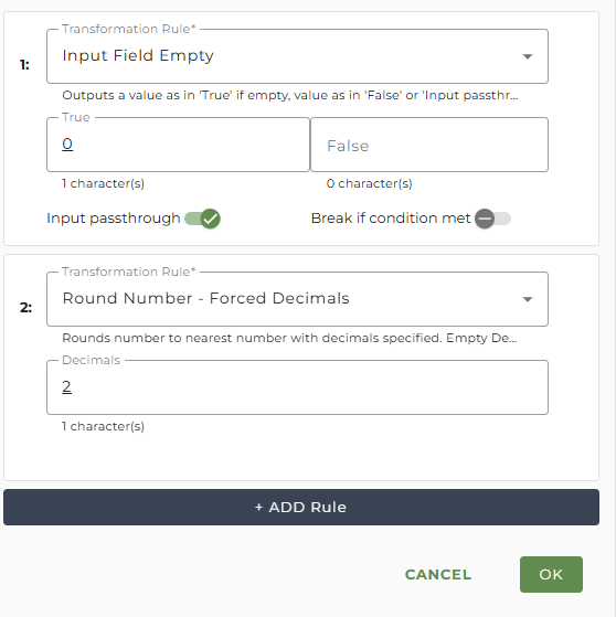Click ADD Rule to add another rule, select 'Round Number - Force Decimals' and enter a 2 into the Decimals field.