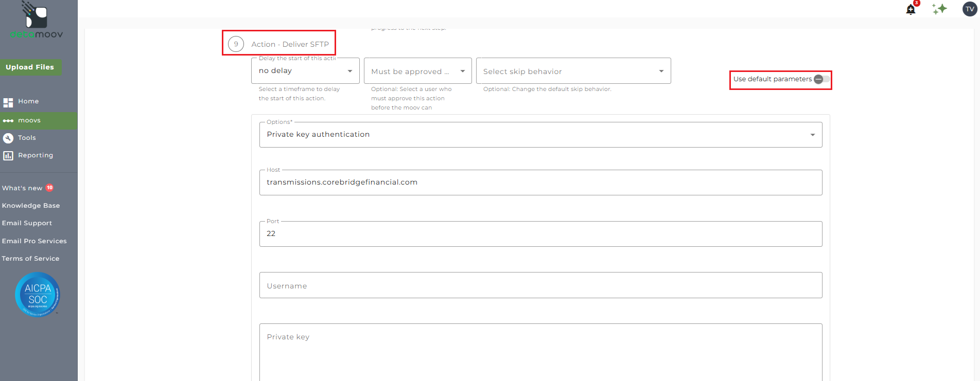 To override the Deliver SFTP step, locate the Action - Deliver SFTP step and toggle the "Use default parameters" off.
