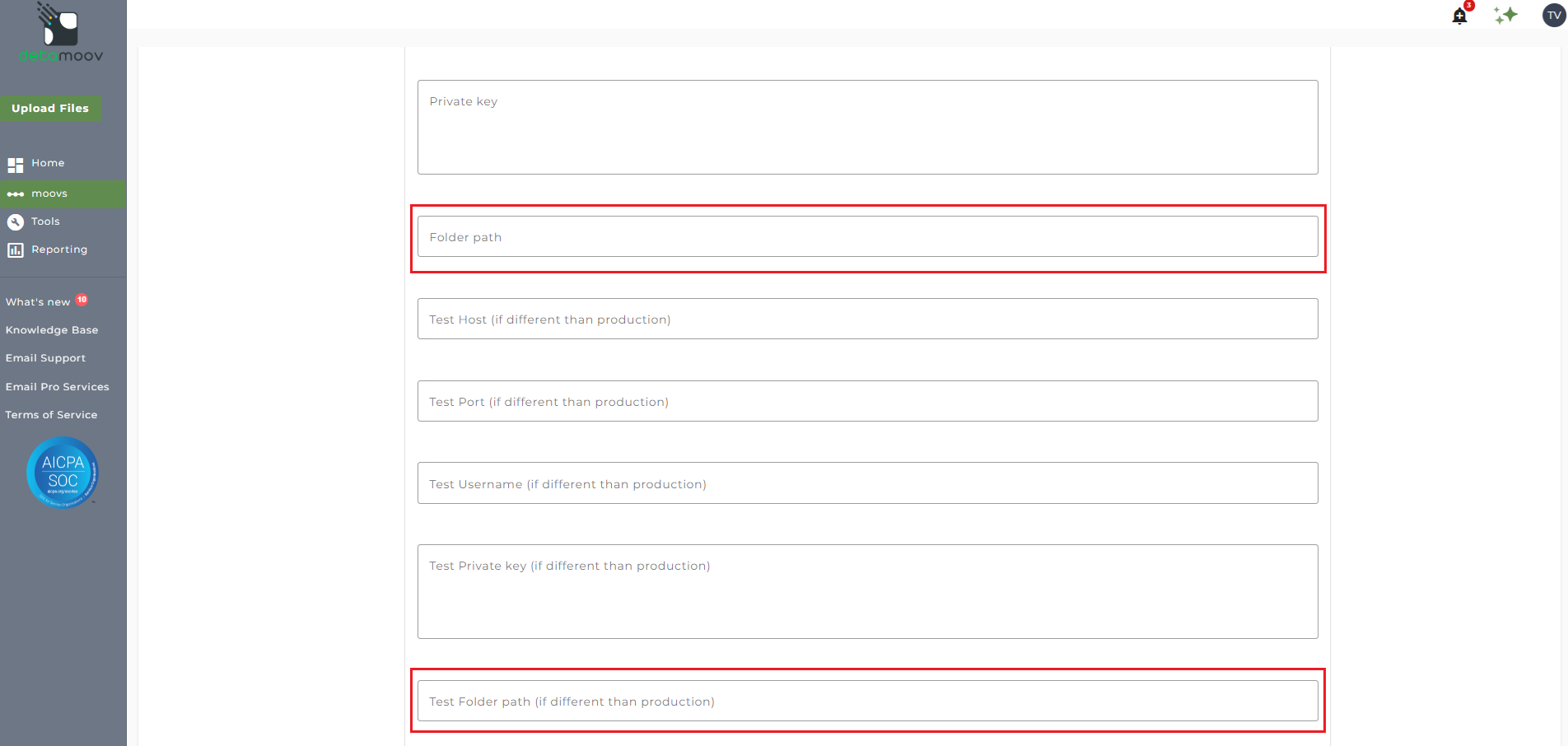 Then provide the plan specific folder path for production files in the "Folder path" field, and the test file folder path in the "Test Folder path" field. No other field should be removed or modified.