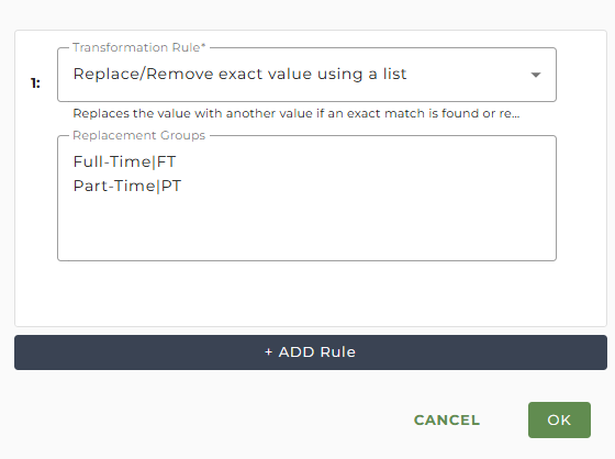 If the value in payroll does not match the Corebridge Financial values mentioned above, you will need to add a replace rule. Click ADD Rule and select the 'Replace/Remove exact value using a list' rule.