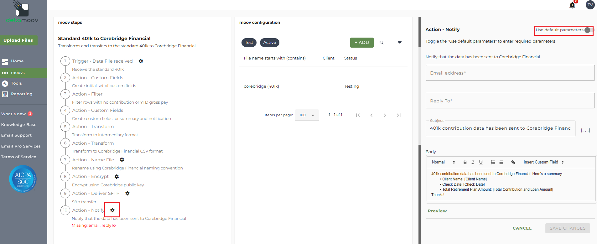 The Standard 401k to Corebridge Financial moov provides a notification for when the moov is complete. The notification can be sent to any email address you wish and can also be configured to send to multiple email addresses.