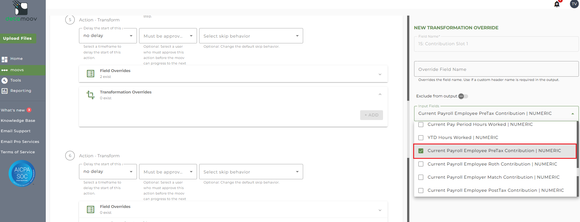 For example, to map the Employee Pre Tax Deferral in Slot 1, locate step 5: Action - Transform, expand the Transformation Overrides panel and click the Add button.