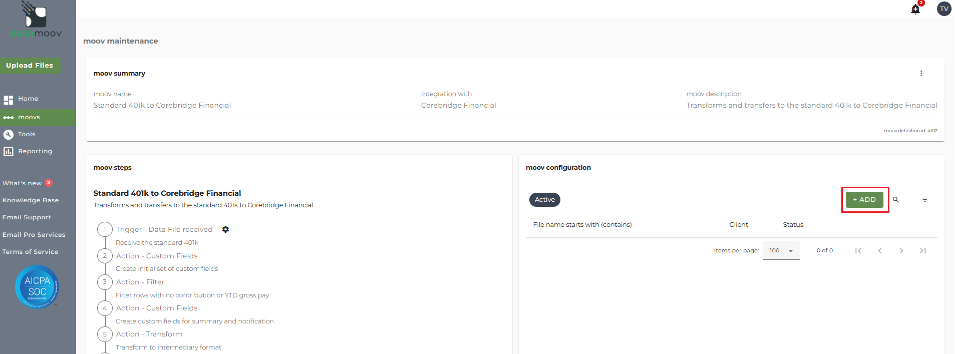 In the moov configuration section, click the Add button to add a new client to send retirement data to Corebridge Financial.