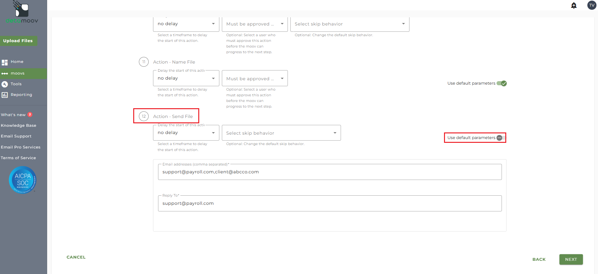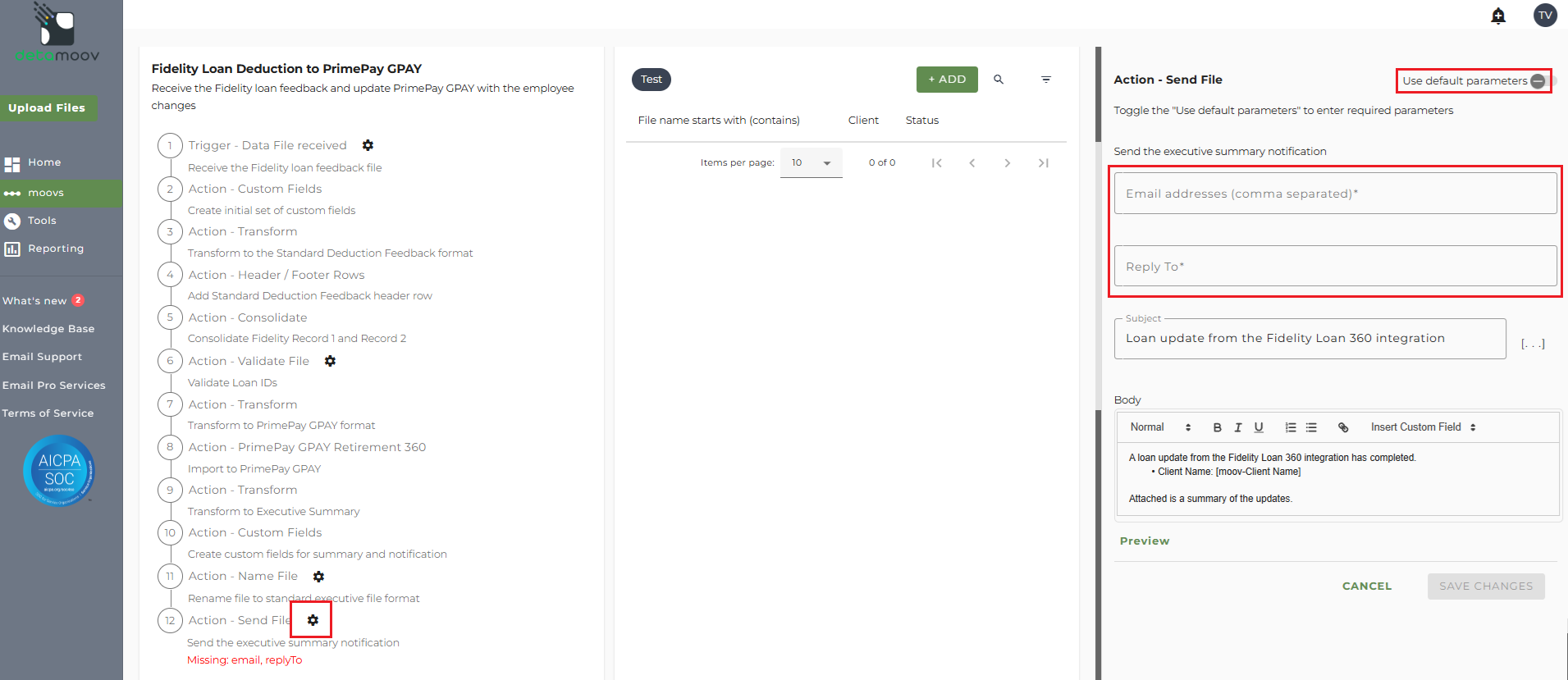 Note: these settings apply to any client configuration you set up for this specific moov. You also have the ability to configure the send file step for each client configuration if you wish to add or remove email addresses per client.