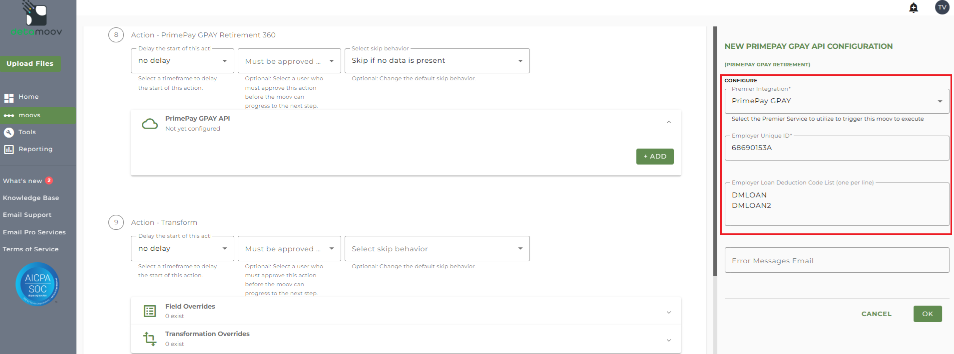 The Fidelity Loan Feedback to PrimePay GPAY moov provides a notification once the moov is complete with a summary of the retirement plan changes that were made in PrimePay GPAY. The notification can be sent to any email address you wish and can also be configured to send to multiple email addresses.