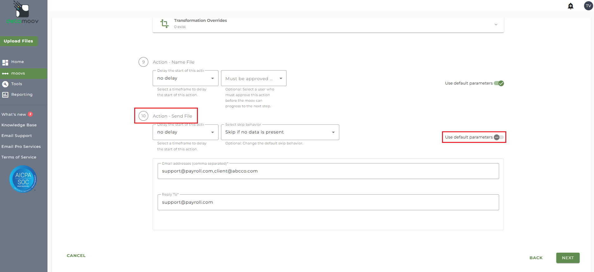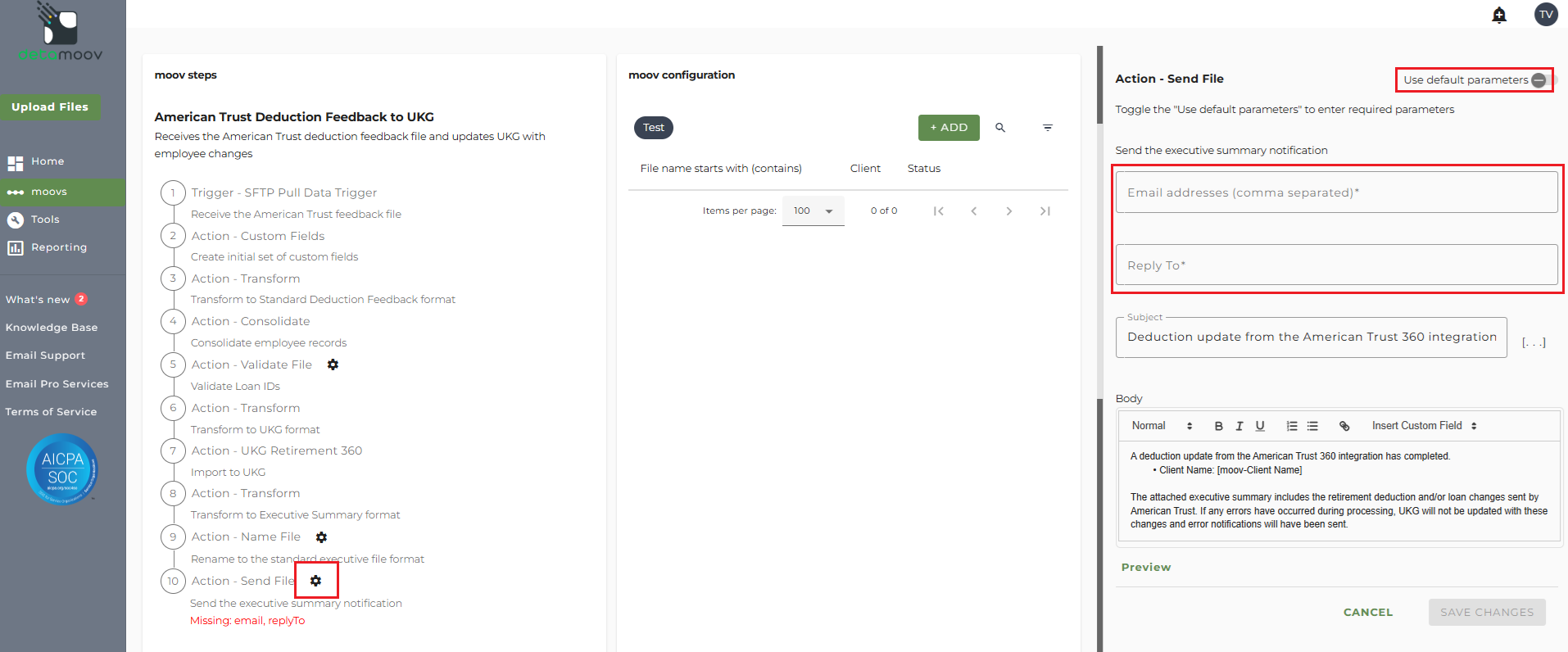 Note: these settings apply to any client configuration you set up for this specific moov. You also have the ability to configure the send file step for each client configuration if you wish to add or remove email addresses per client.