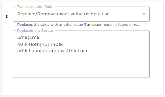 On the side panel that appears, in the Replacement Groups field, replace the right side of 401k|401k with your client's deduction code.