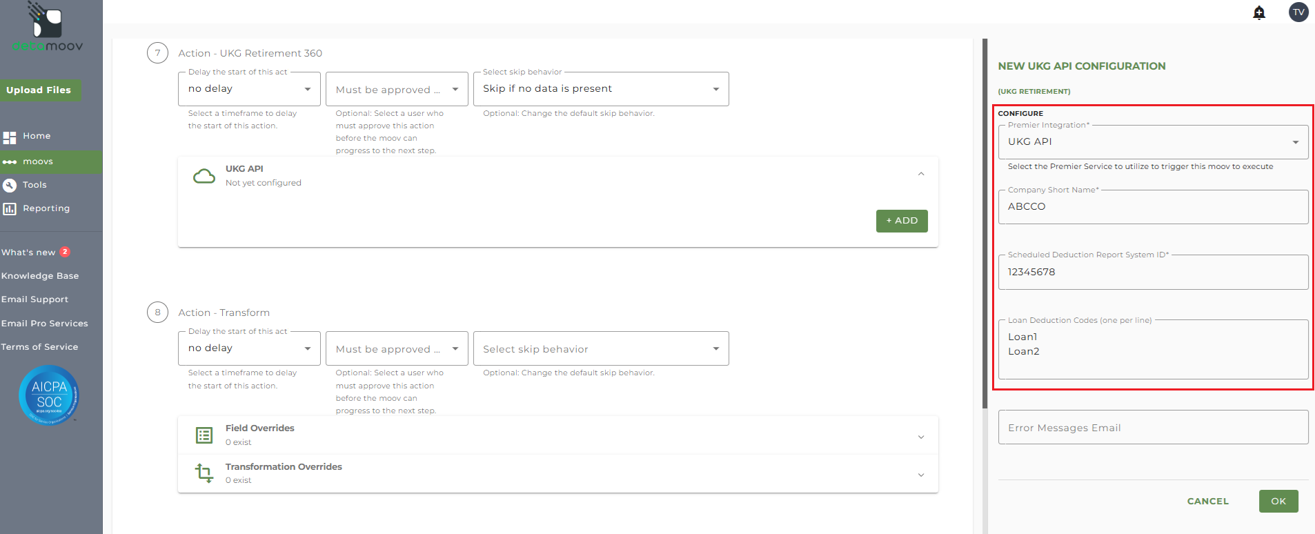 You can also enter in one or more email addresses in the Error Messages Email. If left blank, all detamoov users on your account will receive emails if the UKG API import fails.