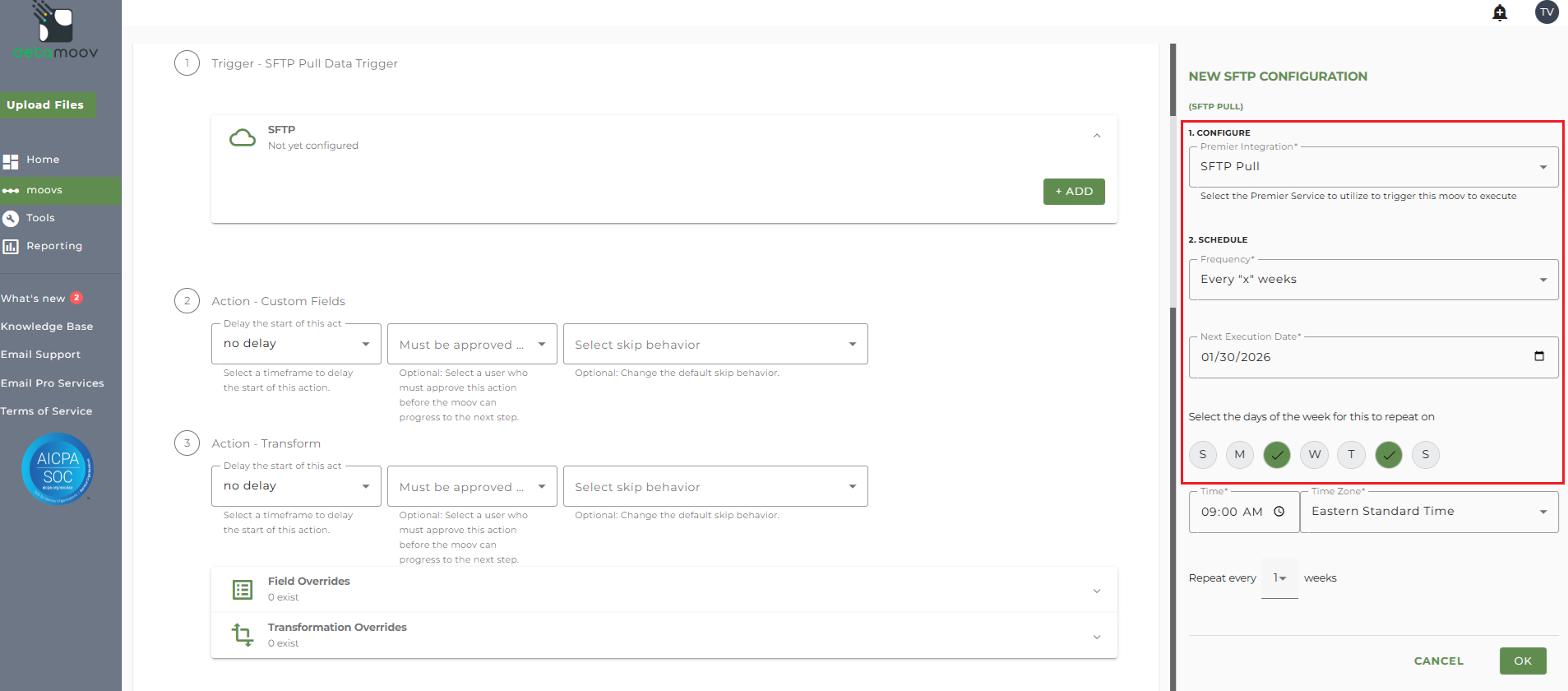 On the New SFTP Configuration section on the right, select the SFTP Pull option from the Premier Integration menu. Then select either "Every X weeks" or "On certain days of the month", depending on how often you would like detamoov to check for new deduction files. We recommend that you check for feedback files at least twice a week. In the example below, we have set up a schedule to check for files twice a week on Tuesdays and Fridays.