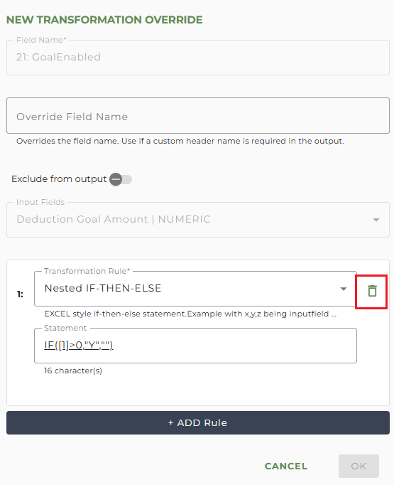 To provide a transformation override, locate step 6: Action -Transform, expand the Transformation Overrides panel and click ADD.