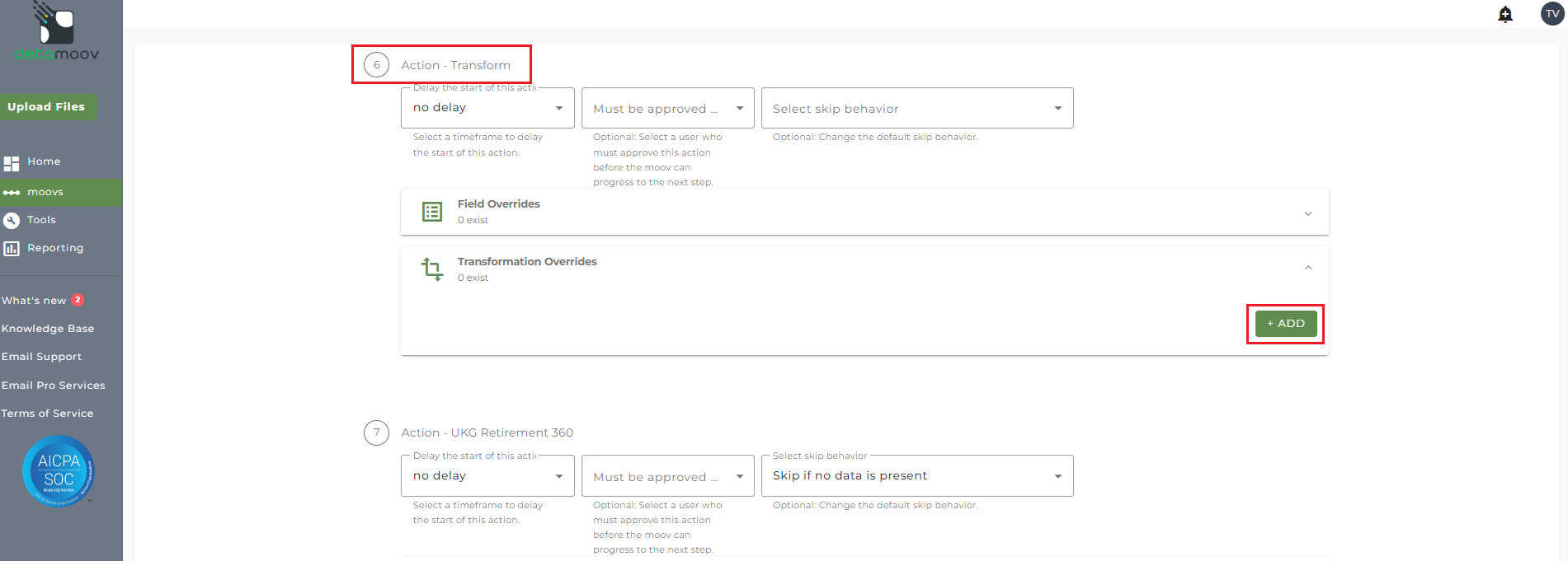 To provide a transformation override, locate step 6: Action - Transform, expand the Transformation Overrides panel and click ADD.