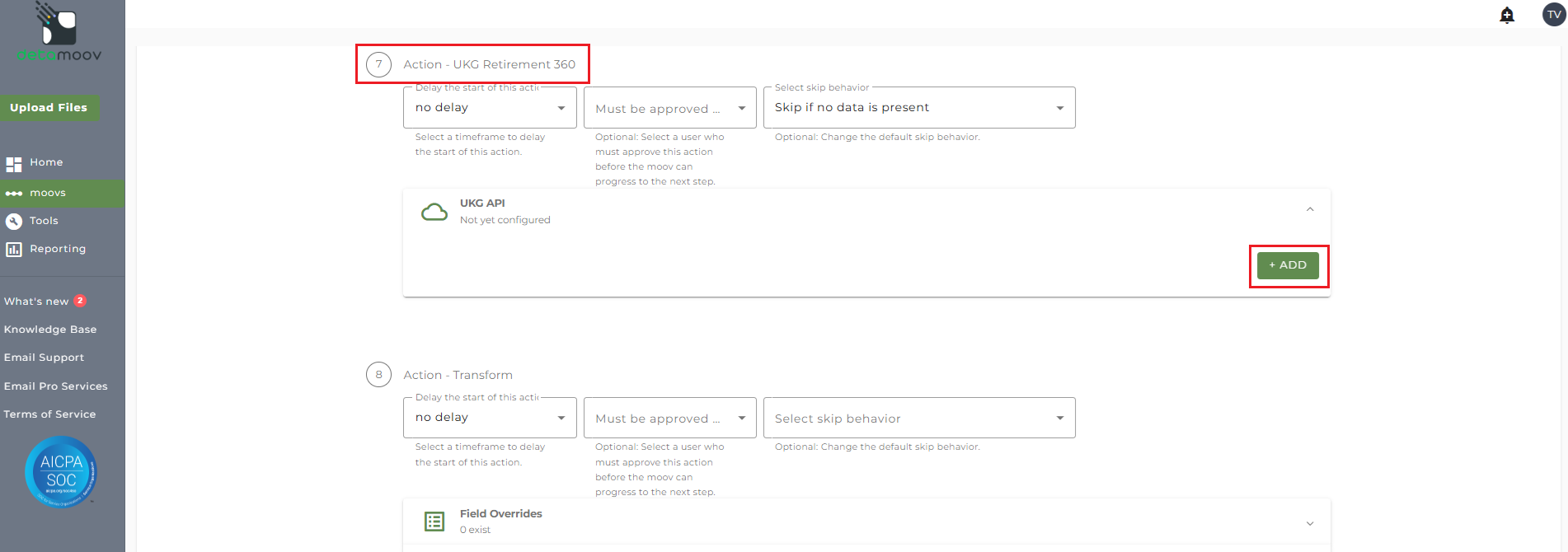 To configure the UKG Retirement 360 step for you client, locate the Action - UKG Retirement 360 step, expand the UKG API panel and click ADD.