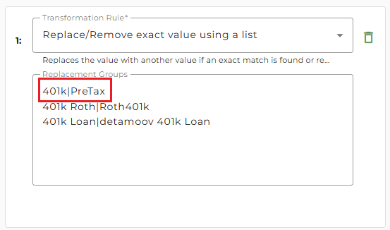 detamoov receives the American Funds deduction code PTXP (percent) or PTXD (dollar) and converts it to 401k. A transformation is then performed to convert 401k to the UKG code. By default, this value would be 401k. If your client's deduction code is different in UKG, say your UKG deduction code is PreTax instead of 401k, then you will need to provide a transformation override for the Deduction Code field.