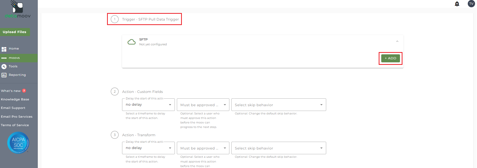 American Trust makes the feedback files available for your client daily to pull only if employee changes were made. To ensure that the feedback files are pulled, you will need to automate the 360 integration by configuring the SFTP schedule. Click the SFTP banner under the Trigger - SFTP Pull Data Trigger step and click Add.
