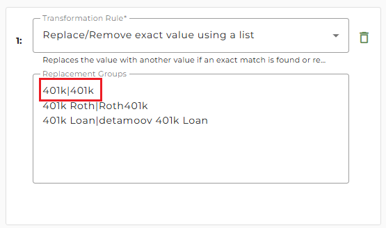 On the side panel that appears, in the Replacement Groups field, replace the right side of 401k|401k with your client's deduction code.