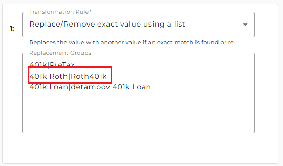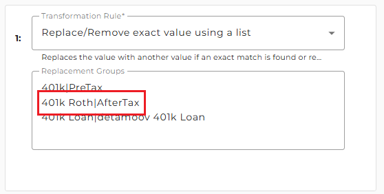 On the side panel that appears, in the Replacement Groups field, replace the right side of 401k Roth|Roth401k with your client's deduction code.