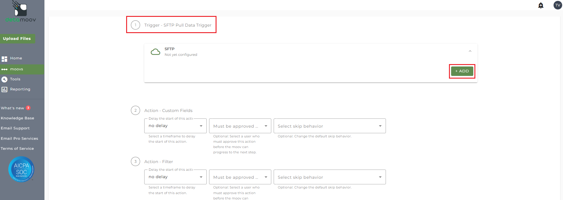 BPAS makes the feedback files available for your client on a Daily basis, only if changes were made by an employee. To ensure that the feedback files are pulled, you will need to automate the 360 integration by configuring the SFTP schedule. Click the SFTP banner under the Trigger - SFTP Pull Data Trigger step and click Add.