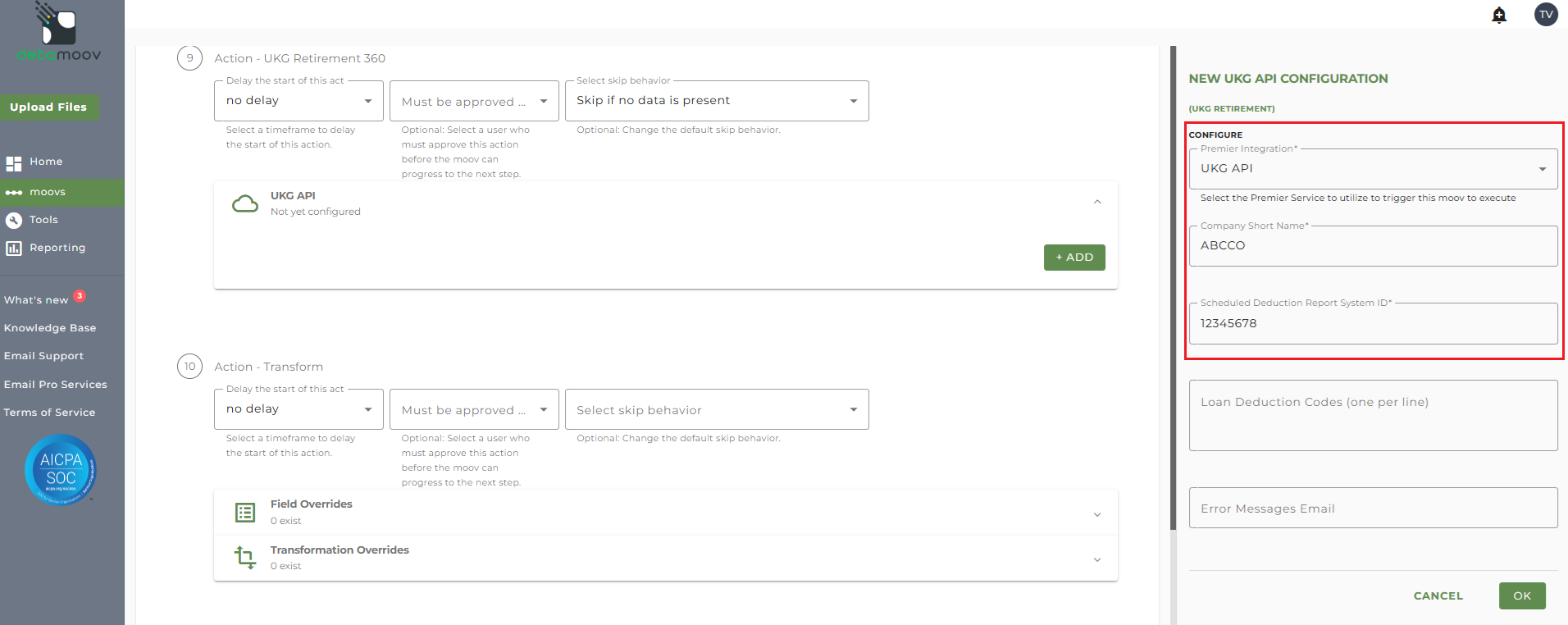 detamoov uses a Scheduled Deductions saved report that is called through the UKG API. Each company will need to have this report created before the 360 integration can be configured. See the Create the Scheduled Deduction Report for 360 Retirement Integrations article for steps on how to create this report.
